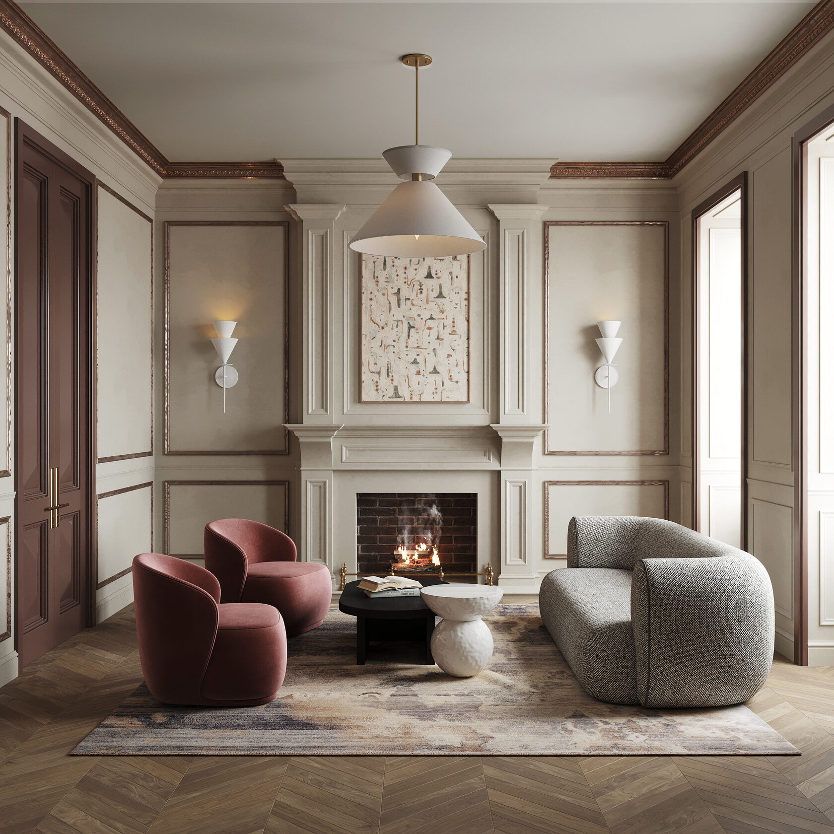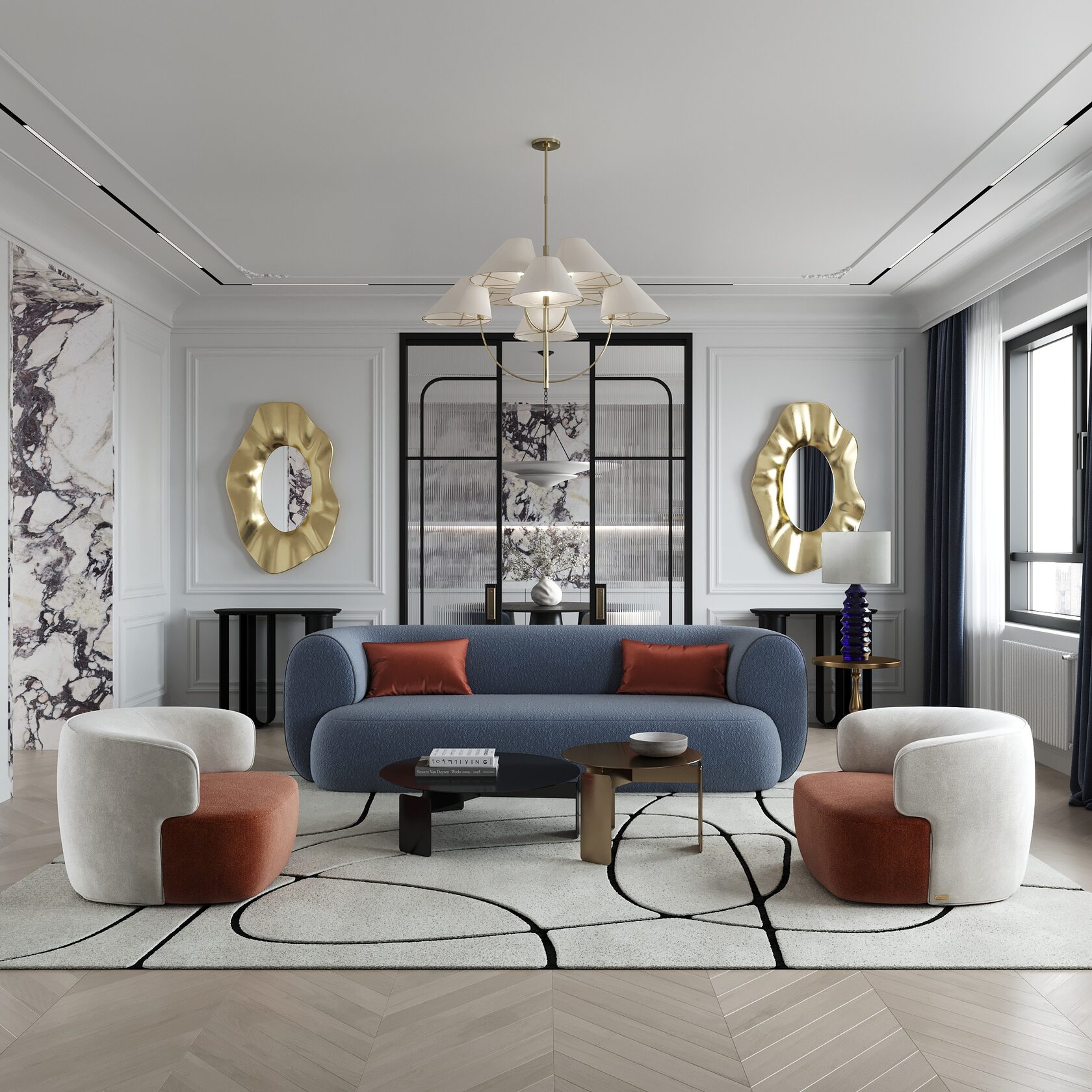 Велюр. Ткань с мягким, густым ворсом, который делает ее очень приятной на ощупь. Благодаря особому переплетению нитей, поверхность велюра по-разному отражает свет под разными углами, что придает ткани визуальную глубину и насыщенность цвета. Однако стоит учитывать, что велюр довольно капризен в уходе: он может приминаться, на нем могут оставаться следы от прикосновений. Велюр часто выбирают для гостиных в классическом, гламурном стиле или в стиле ар-деко.